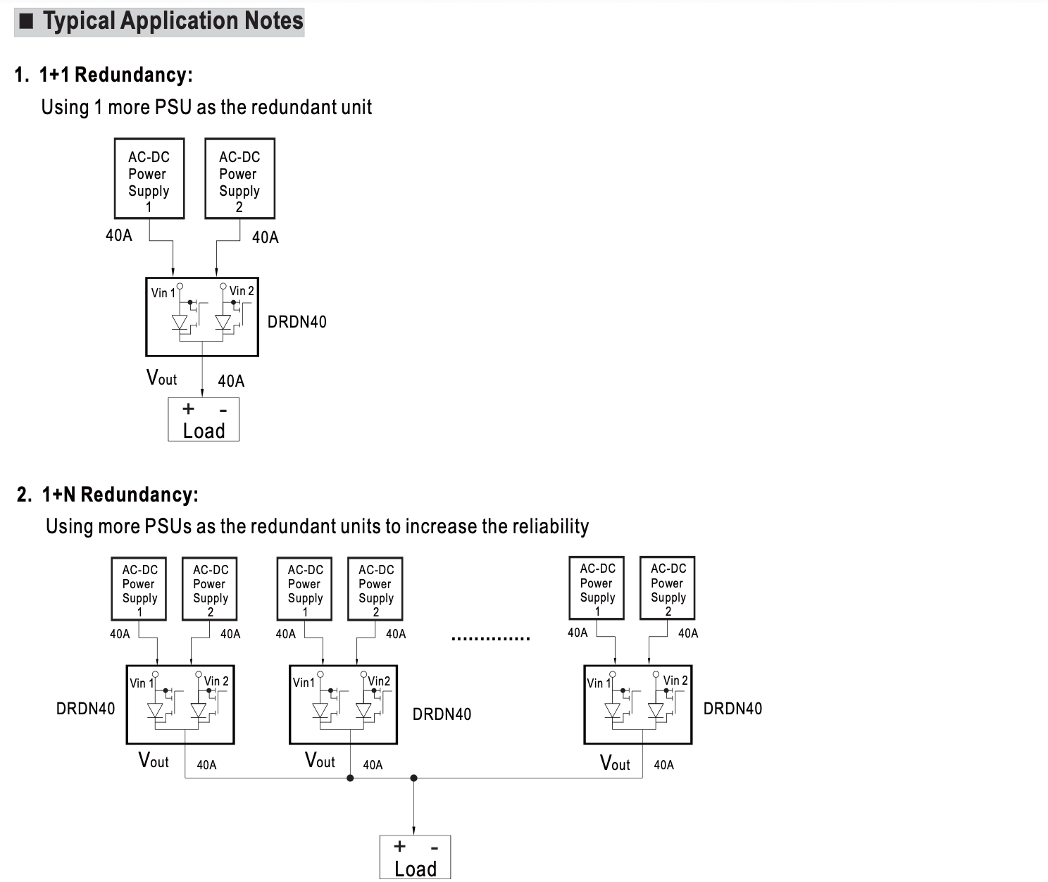 Módulo de redundancia de alimentación para fuente de poder y/o sistema en 24V DC 40A máximo . Equipo para instalación en riel DIN. Modelo. DRDN40-24 Mean Well. Envíos a todo Chile.